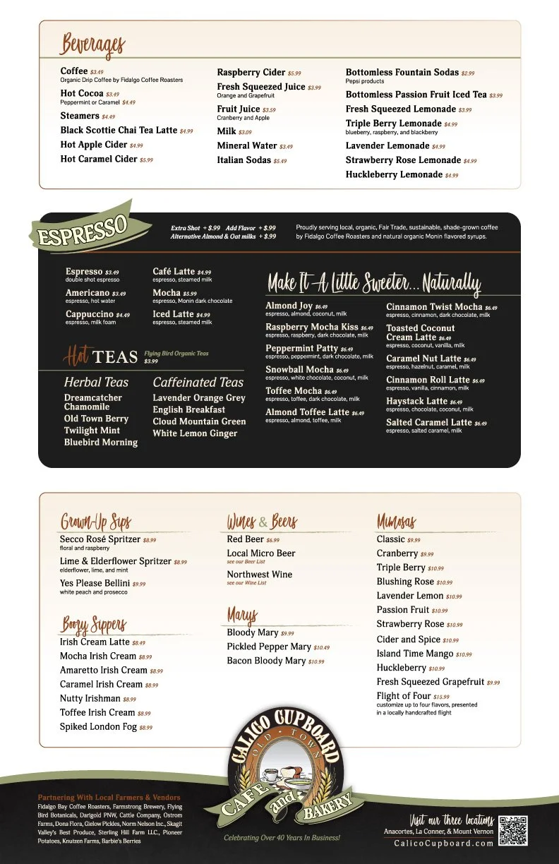 Two custom-designed menus were created for Calico’s Breakfast and Lunch offerings. Their menu was transformed from an 8-page booklet to a now two individual, easy-to-handle, 11" x 17”, double-sided, waterproof menus.